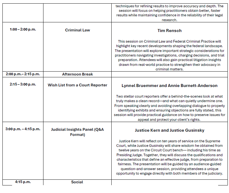 Sessions include Judge Day sharing 43 years of courtroom insight; Jennifer Williams on persuasive legal writing and advocacy; AI-powered legal research tools from Westlaw and LexisNexis representatives; Tim Rensch on criminal law; and “Wish List from a Court Reporter” with Lynnel and Annie.